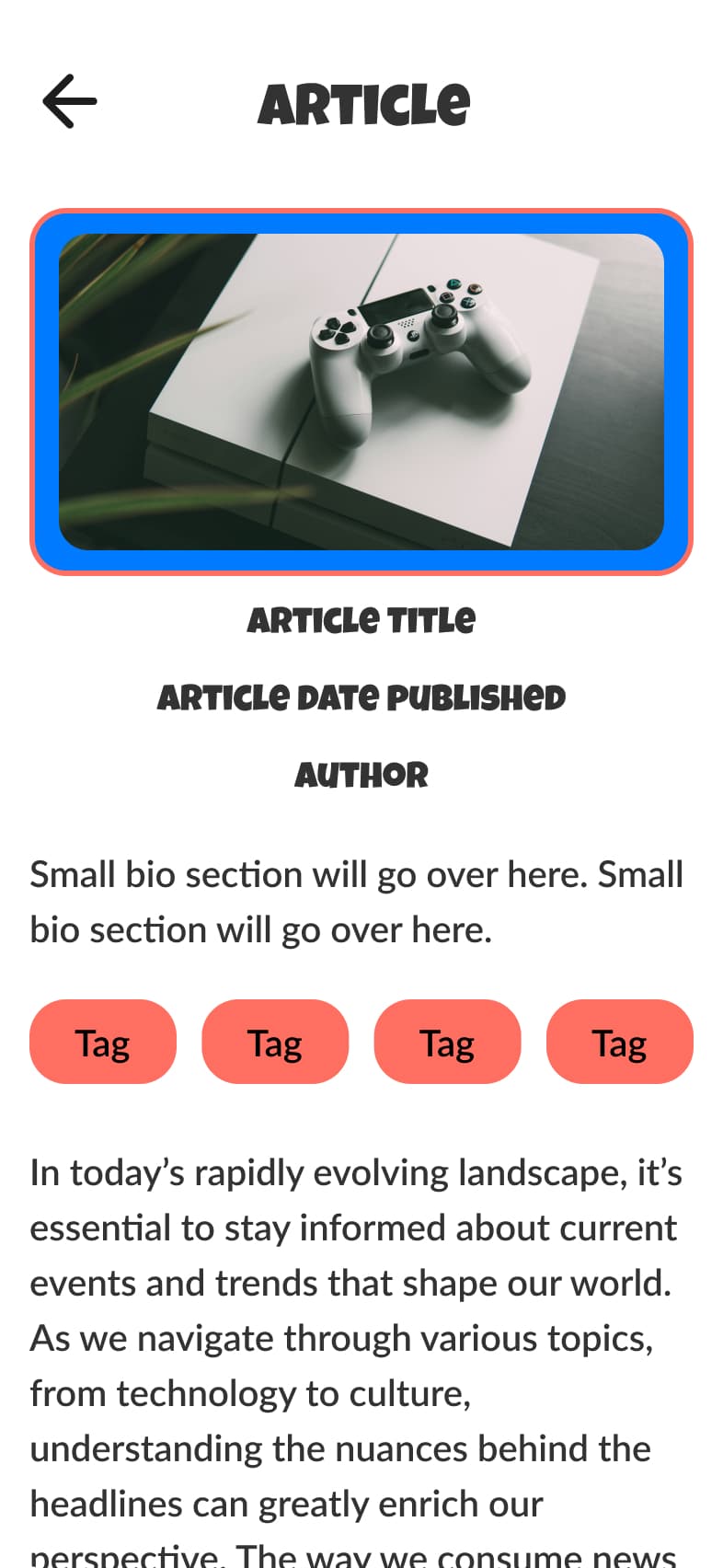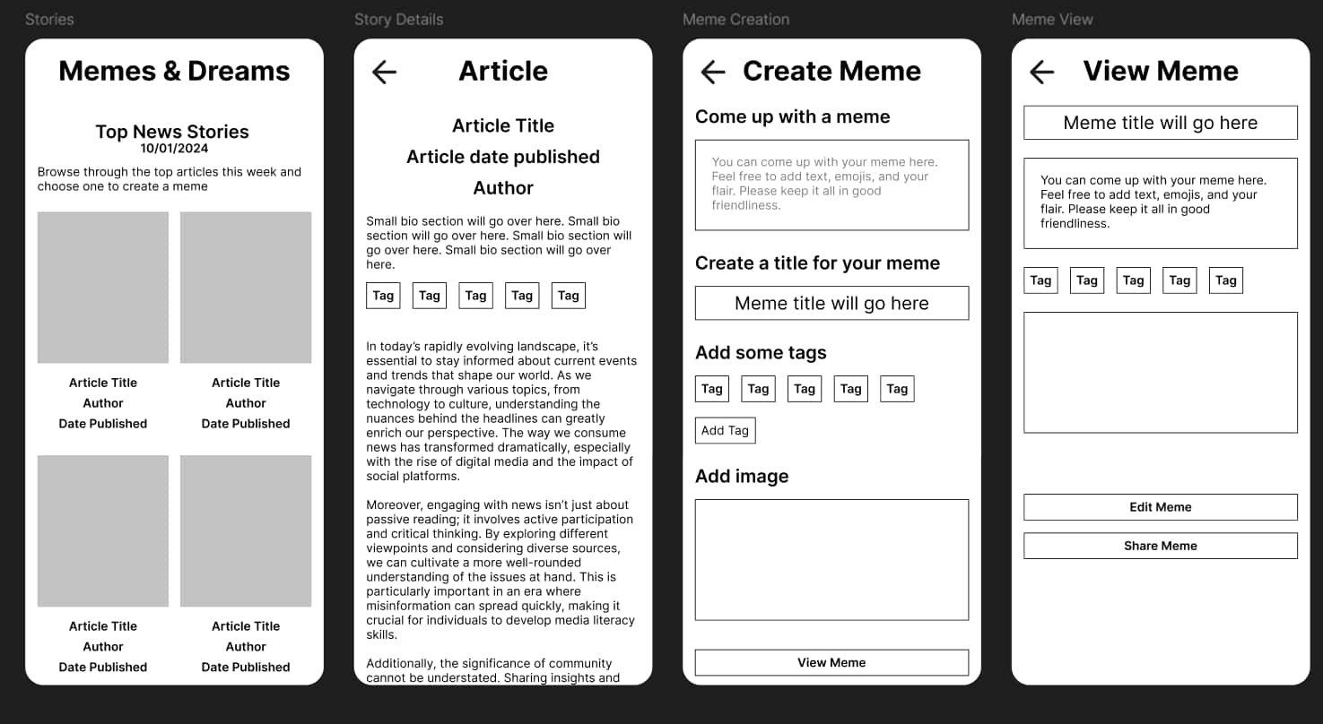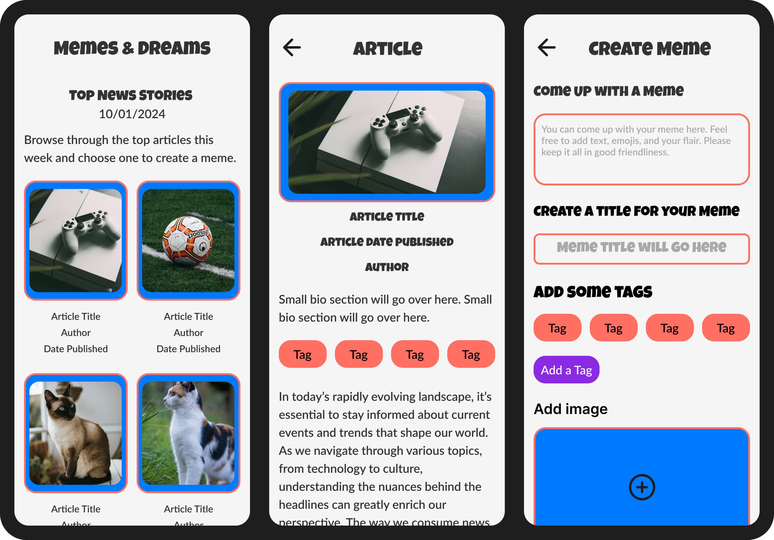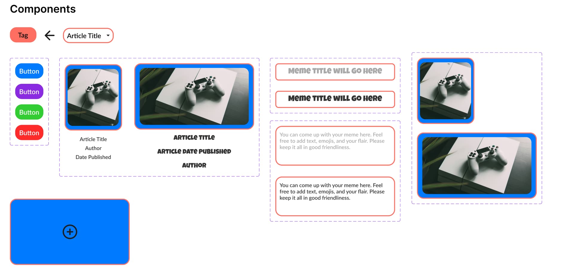 Components: In order to create components for my design system, I first created a user flow to capture the screens needed for the meme creation tool and from there I drafted some digital wireframes showing the process of reading articles, creating memes, and sharing it for others to view. With the wireframes, I was able to create components for my designs such as articles, tags, and buttons. I will showcase the user flow and wireframes directly after this section.