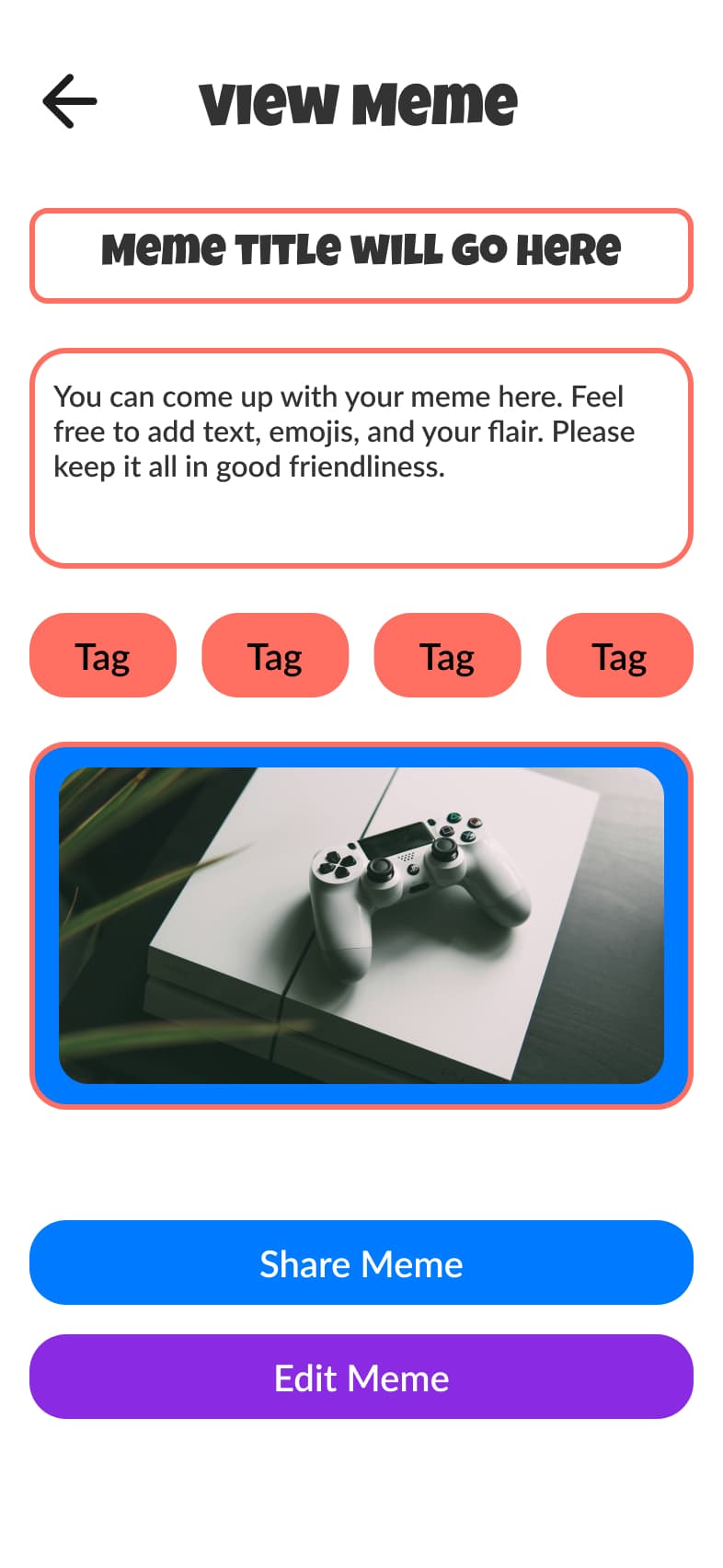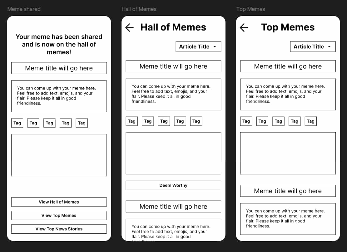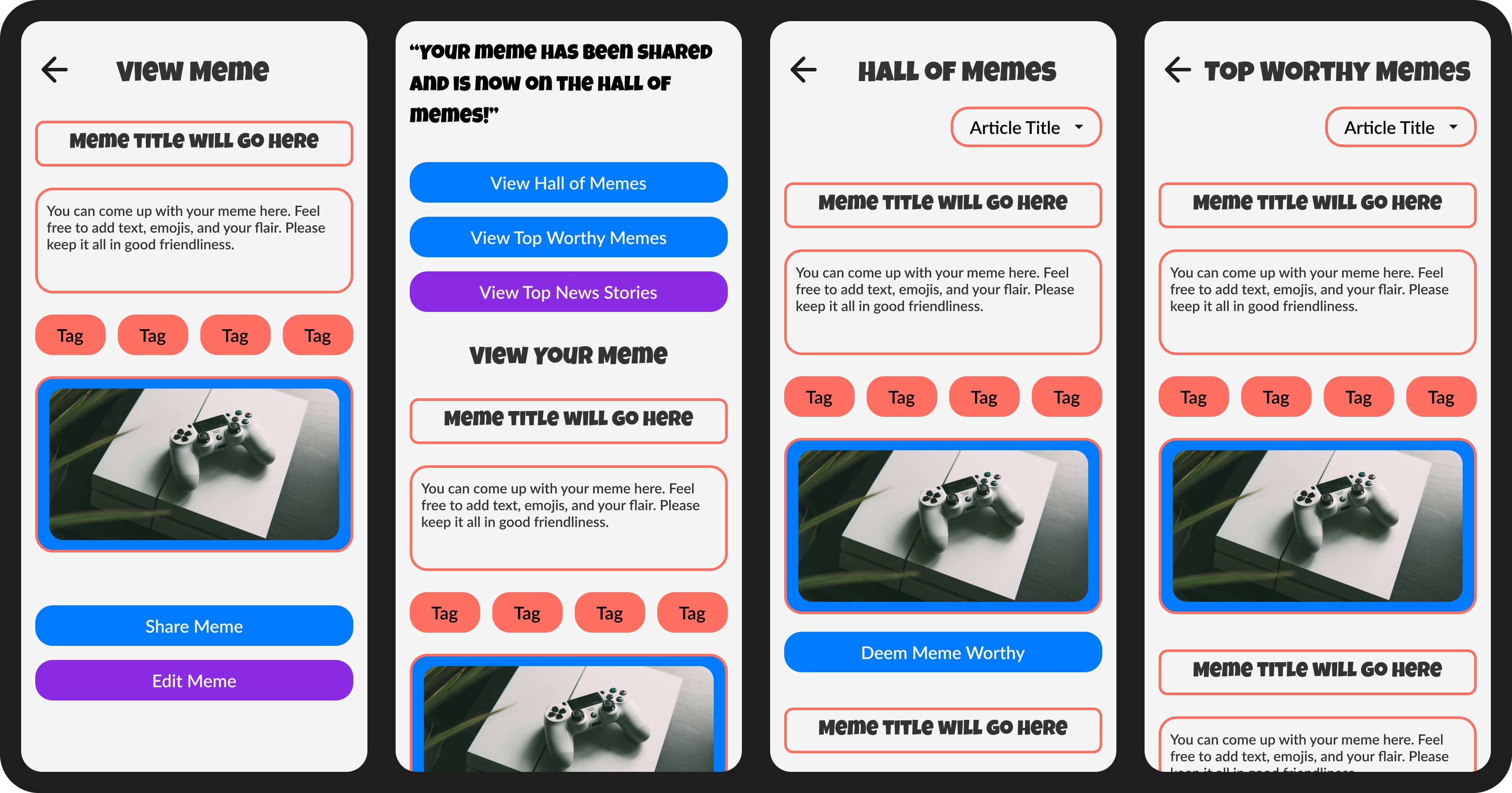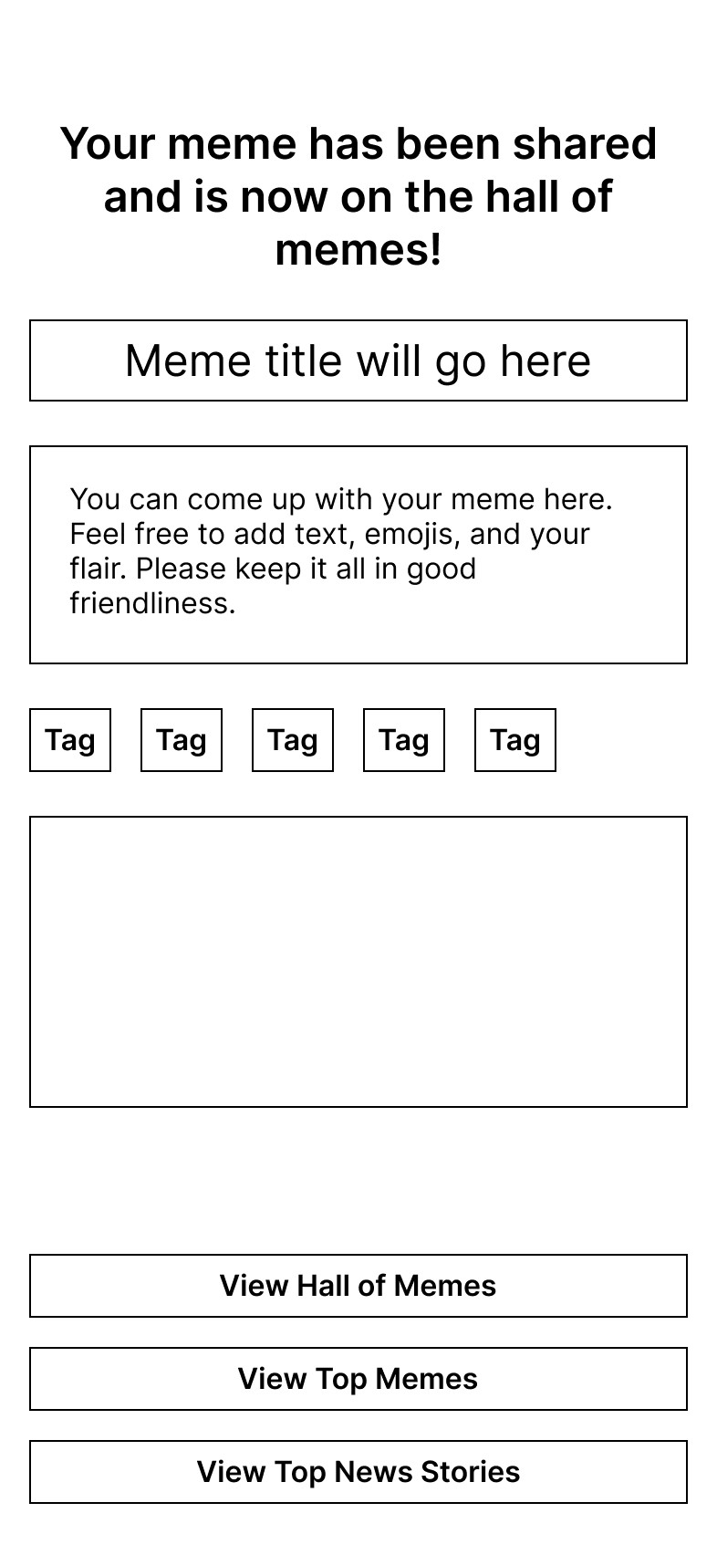 - Make sure in the mockups the buttons "Edit Meme" and "Share Meme" have a primary and secondary state. This will make it easier for the user to know what their main action is.