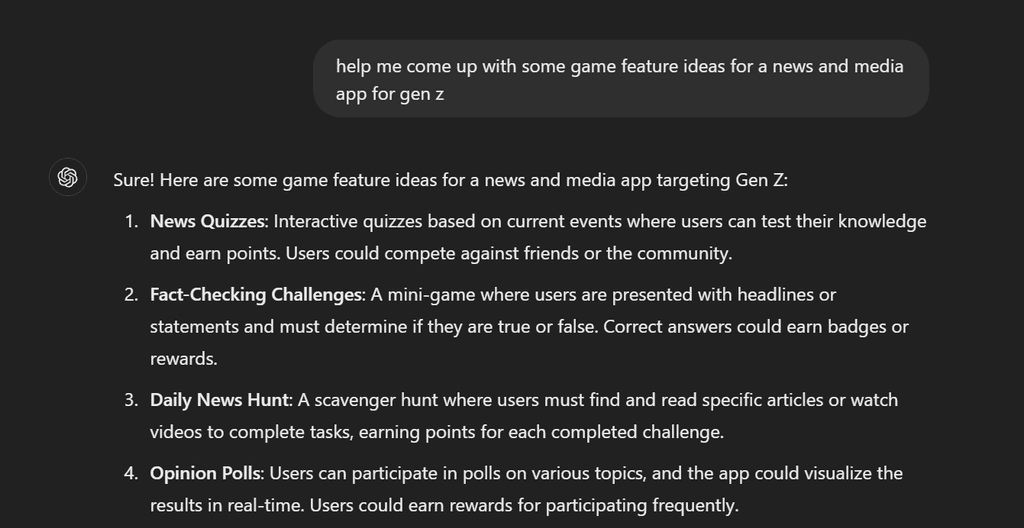 In order to come up with ideas for gaming features for Shades, I used genAI tools like chatGPT. There were plenty of ideas but I condensed it to 4 to prevent users from feeling overwhelmed with choices in surveys.