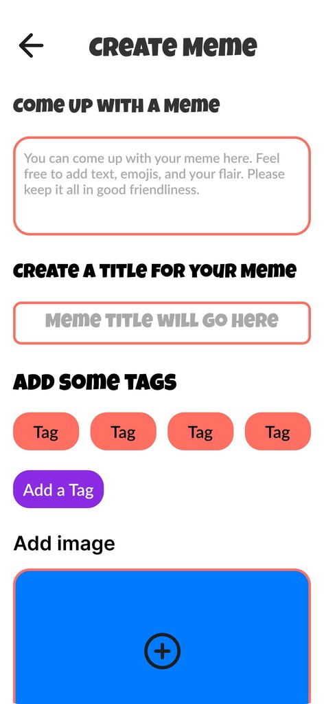 3. User navigates to a meme creation area. There is a text box to create the meme. The user can give tags as well and create a title. They can also choose an image from their phone camera reels. This will all be data for the meme.