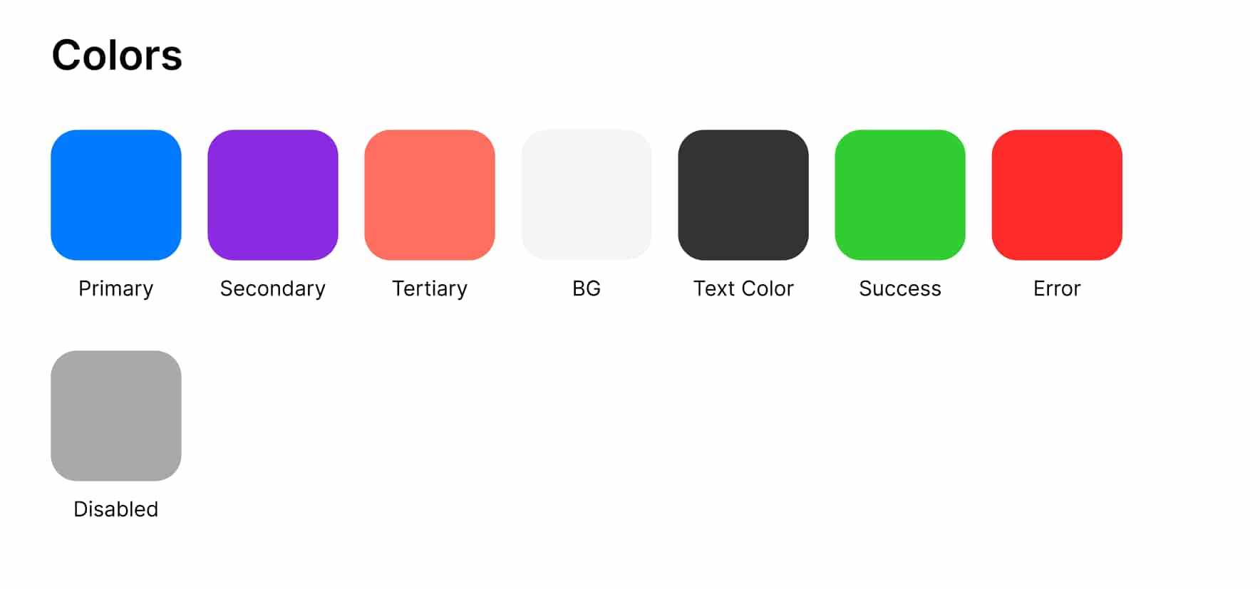The primary color is an electric blue, the secondary color is a darker purple, and the tertiary color is an orange coral. To ensure these colors stood out, I selected a light grey background color. My text color is a dark grey for easy readability. I also have a green success color state and a red error color state. Finally, I have a disabled color state which is grey.