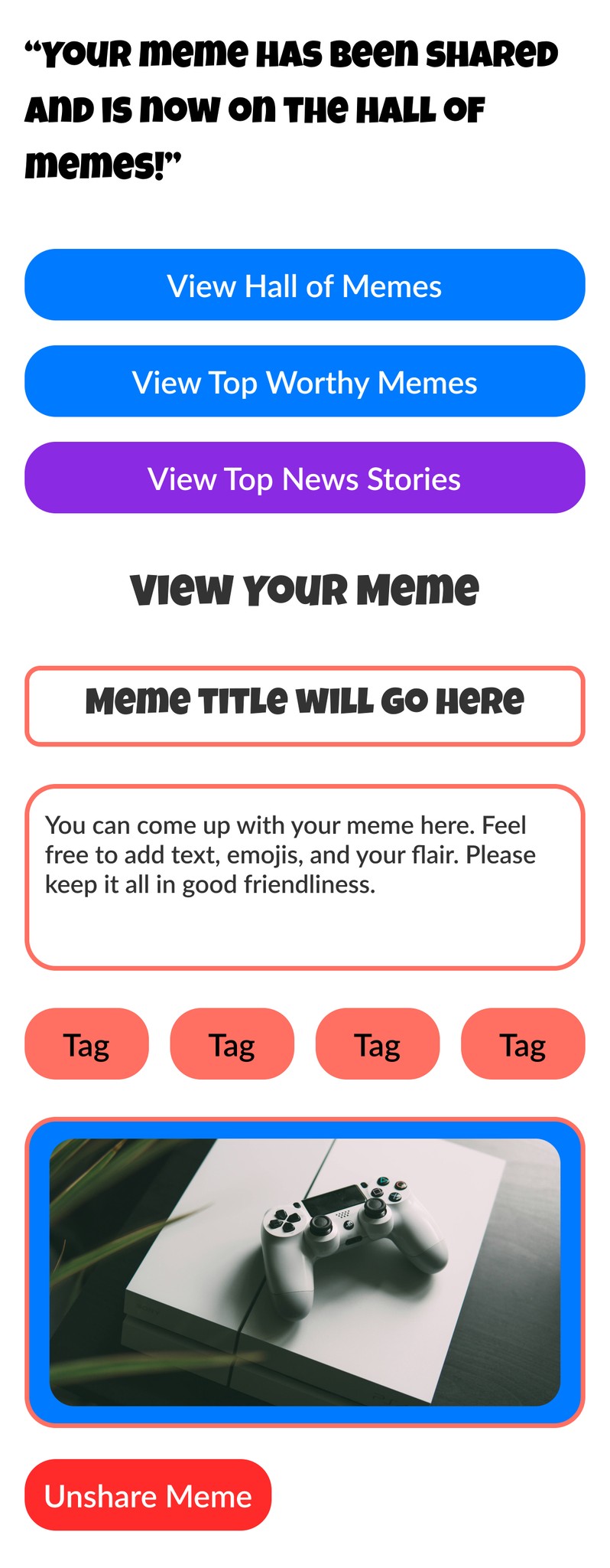 How it works: Users can create memes based on trending news stories. Users will have the option to vote for their favorite memes, which can be displayed in the hall of memes. Everyone's memes will be made available for viewing, but the top memes will have their own designated section.